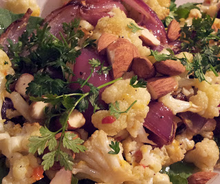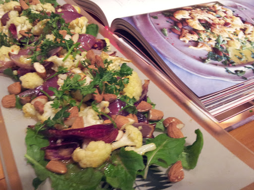 | Roasted cauliflower, red onion and toasted almonds on a bed of rocket |