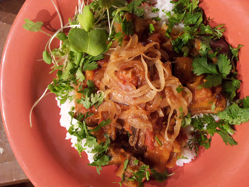 | Eggplant curry served on rice, topped with onion and chopped coriander |