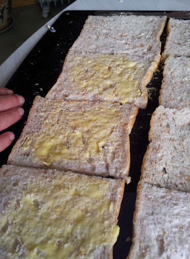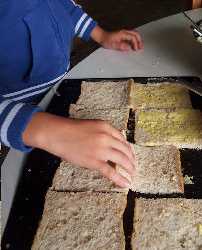 | Alex turning the buttered bread face down on oven tray