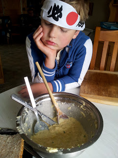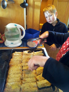 | Alex with the cheese roll mix watching Kerry do the spread of cheese |