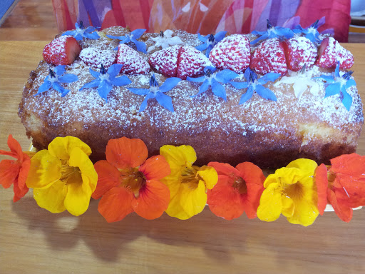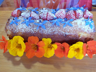 Lemon Tipple Cake dressed up for a birthday celebration decorated with strawberries and icing sugar, borage and nasturtium flowers |