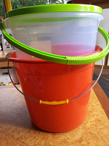 My first homemade attempt at making my own Bokashi Bucket. Ideally the buckets should be the same size. Mine aren’t but I do like the colours! |