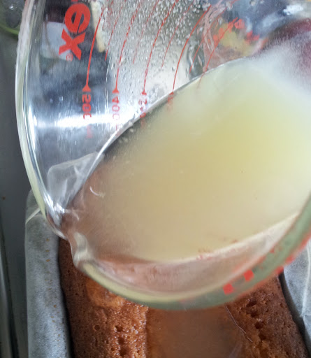 Spoon or slowly pour over the hot lemon cake so that the holes can fill up.