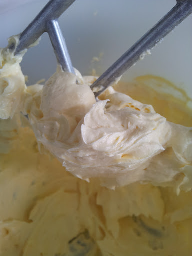 The butter, sugar and eggs should be beaten until light in colour as above. This is what makes the cake light. |