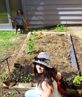 Our raised bed garden 1 week old – everyone helping out; daughter Tansy planting out Rocket seedlings and grandson Beau at the ready with gardening gloves. |