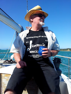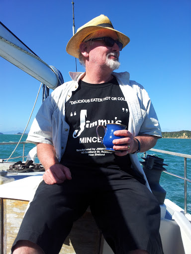 Ralph was born an inlander in Central Otago but you would never know it when you see him so relaxed and happy on the coastal waters. Here he wears a momento from home, a Jimmy’s pie t-shirt from Roxburgh. Ralph says Jimmy’s make the best pies in the South. |