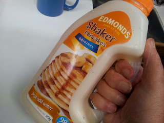 Well… yes you could say this is cheating using Edmonds Shaker Pancakes. Sometimes convenience food has its place and with Maerushia’s additions they were a delicious start to our day. You shake the contents, add water and shake again like mad. First up I didn’t add enough water so my pancakes were too thick for what Maerushia wanted to do with them.