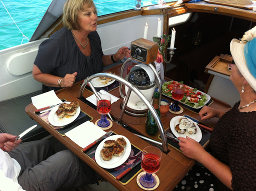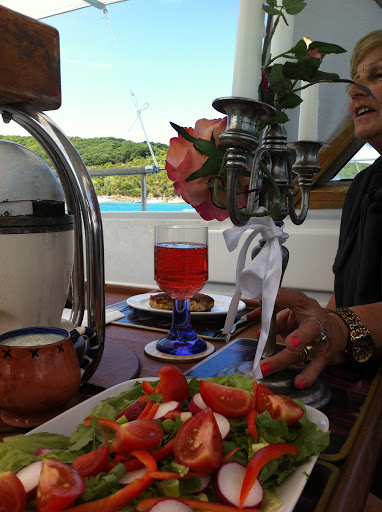 Meanwhile Maerushia prepared a fresh salad of lettuce, tomatoes, radishes and peppers to accompany the chicken rissoles. Ralph set up the table on the deck that cunningly fits around the compass and wheel. Peter had bought a blast from the past to have with our lunch – Mateus Rose`from Portugal. Some of you may remember those distinctive shaped bottles that in the 70’s were often used as candleholders. We were surprised how good it was.