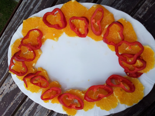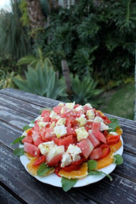 I decided to contrast the pink of melon with an edging of oranges and red peppers and a touch of green with rocket leaves.