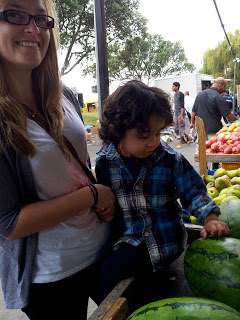 Jessie teaching Beau how to tap a watermelon to check that it is ready – it should sound hollow |