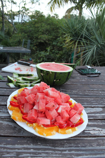 Cutting up the watermelon and taking out as many seeds as you can is what takes the time with this salad. You could let people sort out the seeds for themselves but for our dinner we went that extra step to take them out.