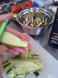 I slice ribbon lengths of courgette using a vegetable peeler. You can also use a mandolin but this is something you have to really concentrate on when using as they can be lethal on fingers. I find for courgettes that cut easily that the vegetable peeler does a good job. The slices have to be thin so that they will bend and thread easily. I used about three courgettes.