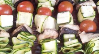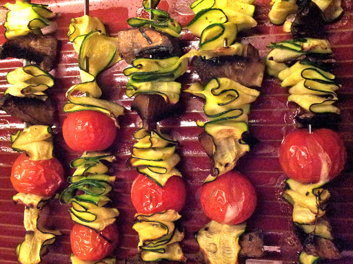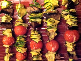 Ribbon cut courgette with Portobello mushrooms and cherry tomatos threaded on kebabs sticks and cooked on a ceramic bbq plate |