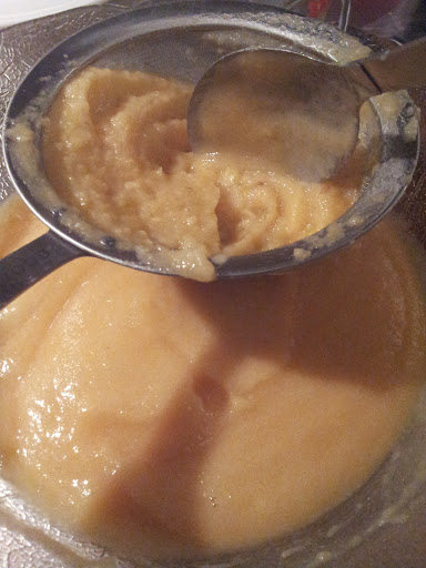 Pushing the puree through a sieve with a wooden spoon is the most labour intensive part of the recipe but it will take out a lot of the graininess in the quince. You can see the two different textures in this photo. If you have a mouli then I recommend using it to cut down the time. |