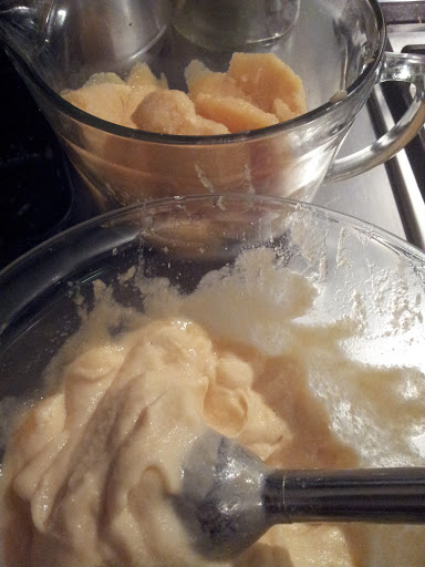 Pour the puree into an icecream container and freeze overnight or for a day. Now you put the frozen puree into a bowl or jug and the ideal instrument in the kitchen for this job is the stick blender attachment you use to puree soups.