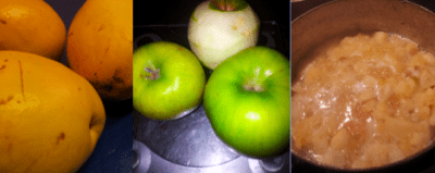 Large golden quinces will perfume a room by just being there; Sturmer apples centre and right the two combined and cooked up in a sugar syrup for Sturmer and Quince Sorbet.