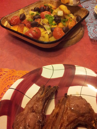 I put the enamel baking dish into a hot oven 180-200 to heat while I cut up potatoes in wedges, a parsnip cut in finger sized batons as it would take the longest to cook, an onion cut into wedges, and a wedge of pumpkin cut into chunks. The prepared vegetables went into a bowl and mixed through by hand with a slurp of oil, salt, pepper and some rosemary (about 2 tsp) chopped up to release the oils. I then spread out the vegetables onto the sizzling hot oven dish and put back in the oven as quickly as possible. Heating the dish allows the vegetables to cook quickly and ensures the potatoes have a crispy skin. Oiling the food rather than the dish avoids the oil burning. Cook for 20-30 minutes. Kerry gave our vegies an Italian touch by adding halved tomatoes and olives in the last 10 minutes and sprinkling chopped basil before they were brought to the table.
