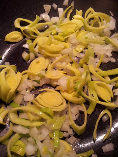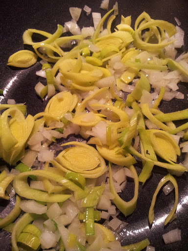 First of all turn on the oven to 180 to 200C and place your pan in the oven to heat up. Then start preparing the greens. I saute or sweat an onion and/or a leek until soft but don’t allow to colour.