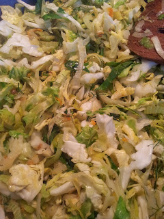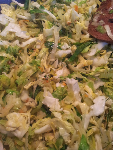 Add sliced up cabbage, kale, brussel sprouts, silverbeet or any other green vegetable like broccoli or beans. I added a fennel bulb from my garden and I used some of the feathery greenery as added flavouring. I had half a dozen small mushrooms left over and I could have added some celery. I found some fresh tumeric the other day so grated about a teaspoon of tumeric into the cabbage mix which adds colour and its unique health properties. You need 4-5 cups of cooked greens and Alison suggests 400-500g of savoy cabbage. Cook until softened. This only takes a couple of minutes. Season with salt and pepper to taste.