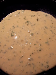 Take out your very hot pan, spray with oil and pour half the mix to cover the base of the pan. The steel pan I was using would quickly lose heat so I placed the pan on a low gas flame while preparing the galette.