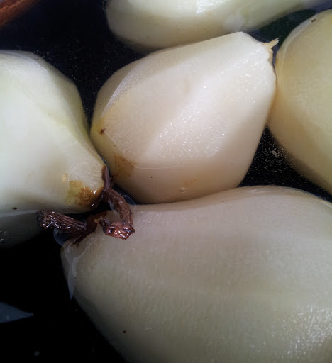 Bring to the boil and then place the whole pears peeled into the pot.