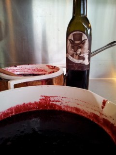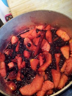 I first make a sugar syrup for 1 kg of fruit – 350g of sugar to 500ml of water adding a cinnamon stick. I add the apple first as it takes longer to cook, then the blackcurrants. I peel the apples to make the sieving process easier and cook it until the fruit is soft and can be easily pureed.