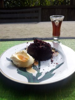 Take out the pears carefully and reduce the cooking liquid until it thickens to give that lovely rich syrupy feel. Once reduced add the liqueur. I just put in a shot, but once again test and if you feel it needs more then add more. Pour the thickened syrup over the pears and let them sit and soak in those QBF flavours of coffee and cinnamon.