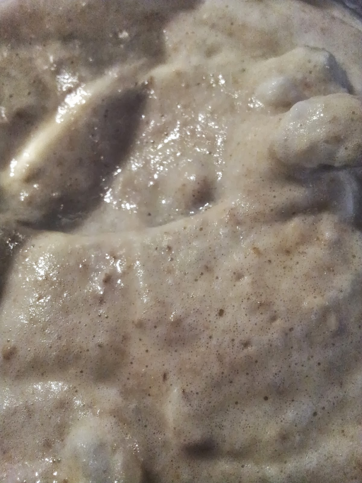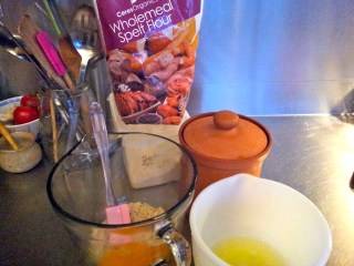 Start by adding to the soaked oats, the two egg yokes, then the flours, sugar and baking powder. Add enough milk to mix to a pouring consistency batter – a little like lightly beaten cream. You may need more or less milk… judge by sight. If you have added too much milk all is not lost, just add some extra flour. You don’t have to worry about over working the mix…until you add the fat (either your chosen oil or melted butter). Add this next and fold in.