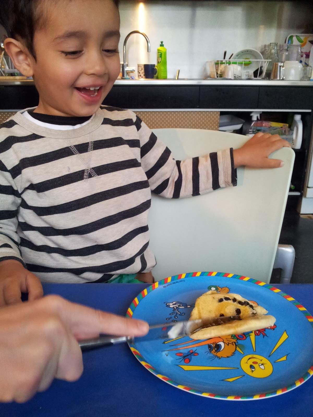 Beau loved his smiley face pancake made from currants. He likes his pancake cut into wedges then a squeeze of syrup. |