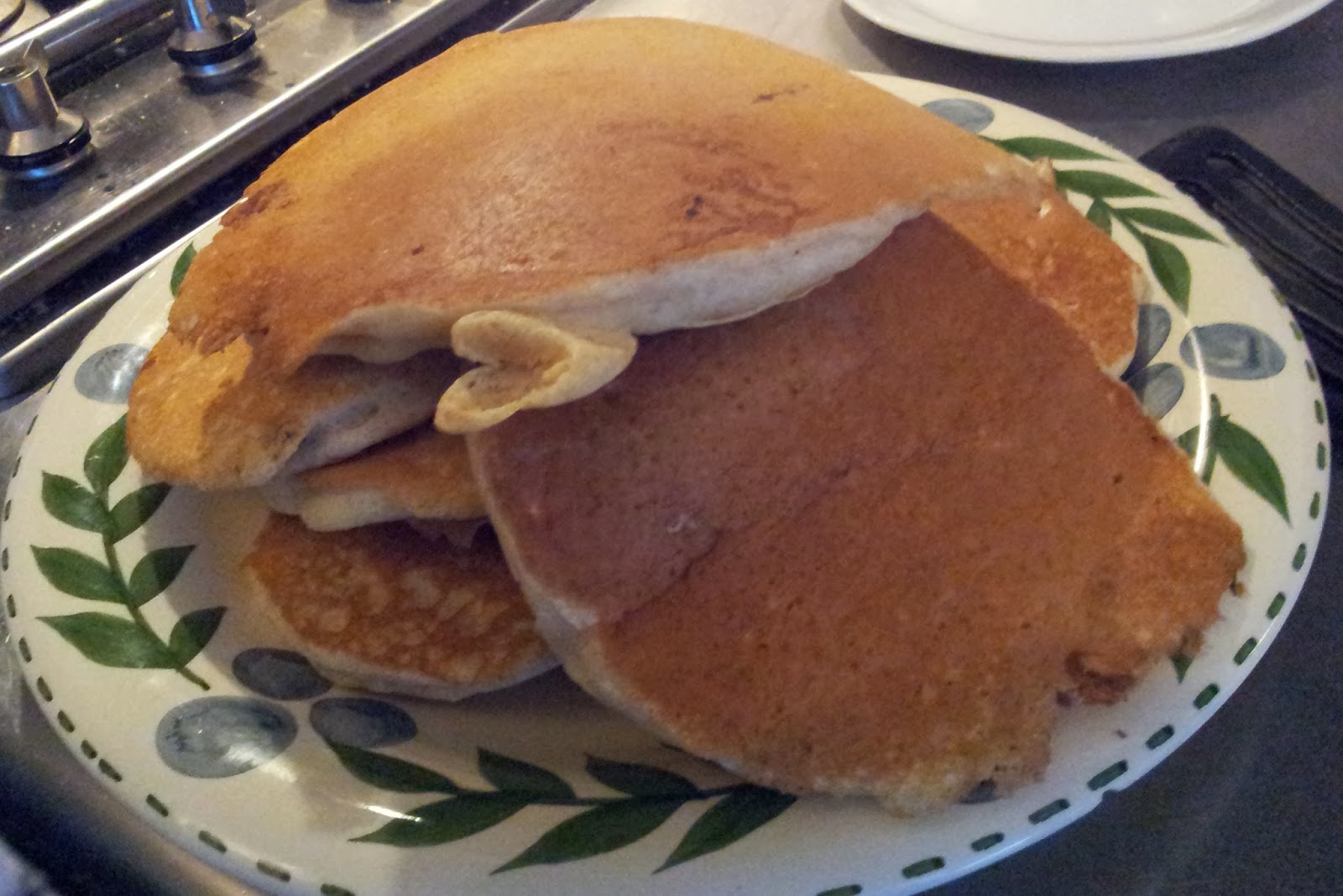 The best pancakes are made from using a heavy caste iron pan because the heat is constant making an even crust. Our landlord and friend Chris has a wonderful selection of cooking pots and I keep one of his large caste iron pans just for pancakes so that I don’t get other flavours transferred to the pancake.