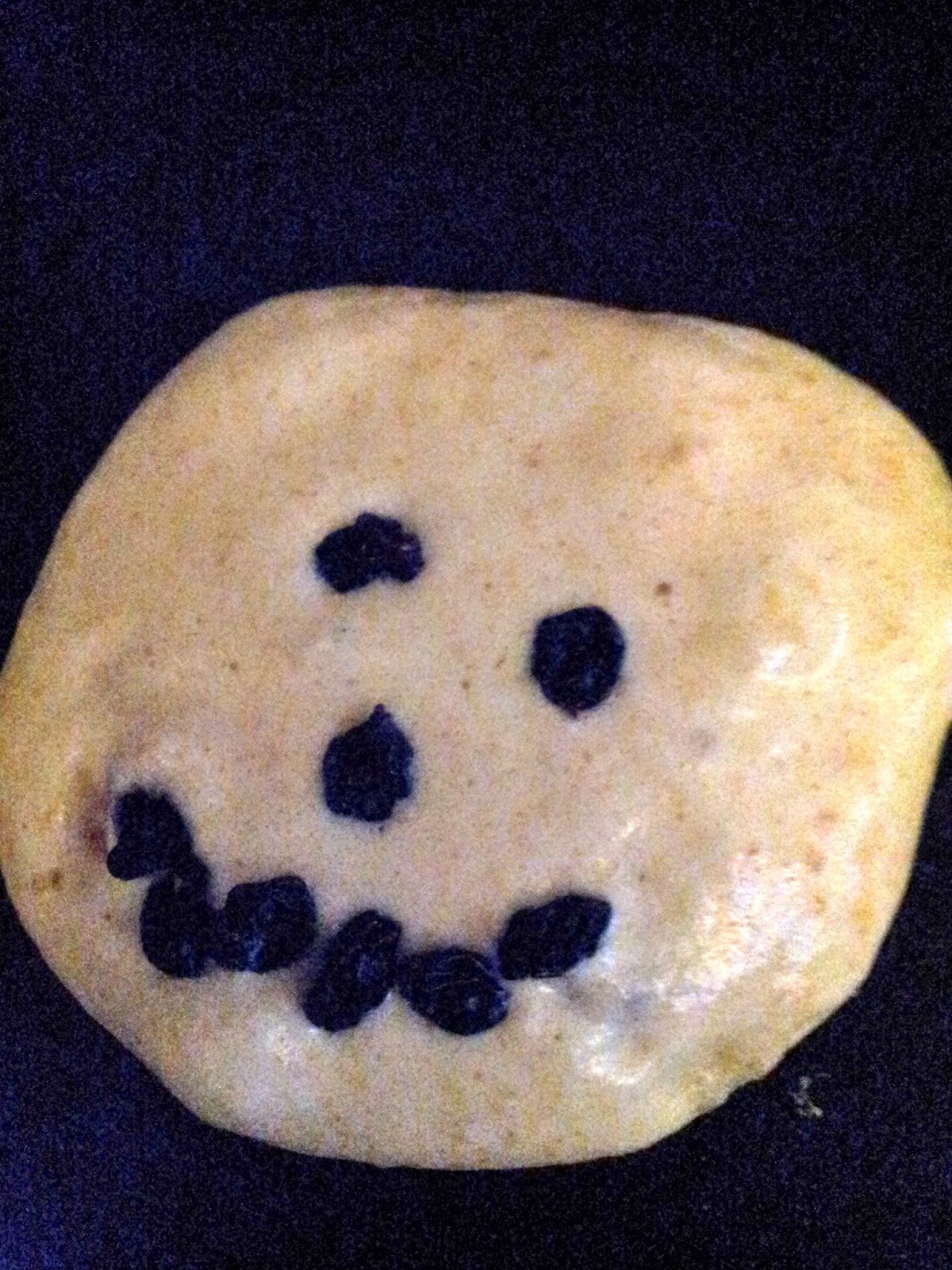 I learnt about adding currants to the top of the uncooked mix from my friend Maerushia and decided I would surprise Beau with a smiley face pancake. |