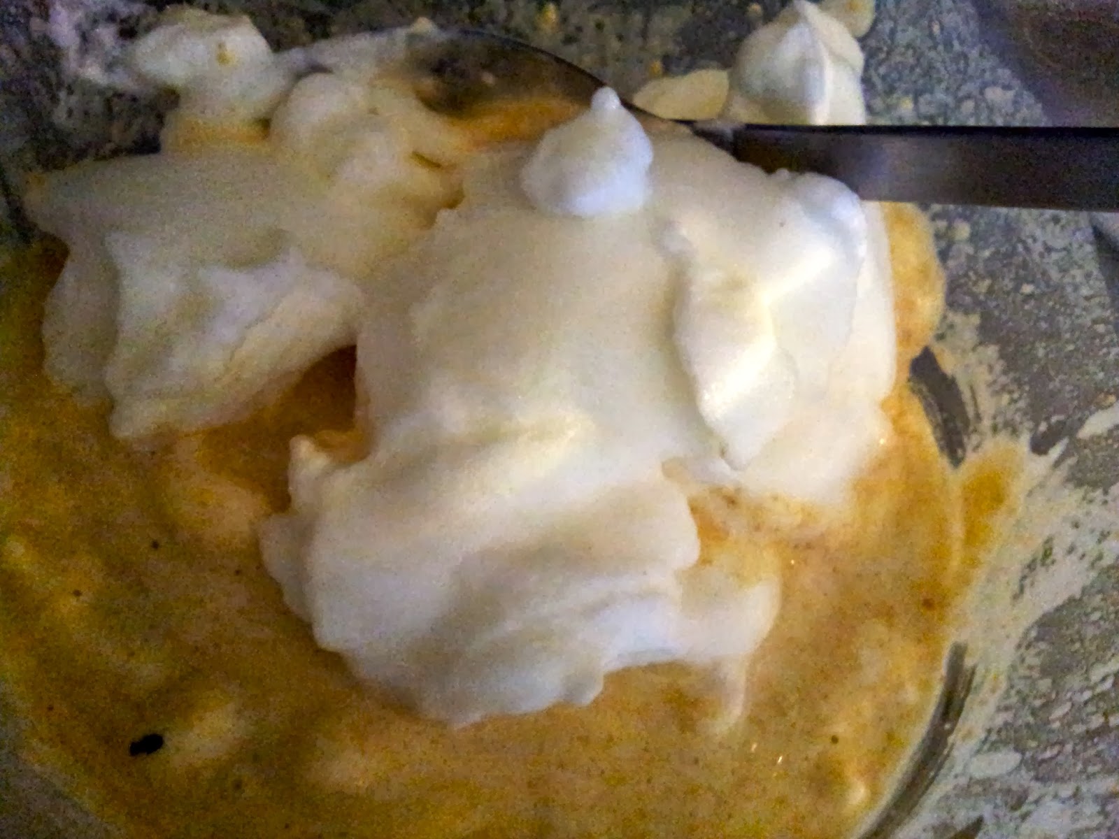 Finally, add the beaten egg white. First, take a spoon full of the beaten egg white and fold through the mix. I usually use the egg white I knock off the egg beater against my hand (not on the bowl) into the mix. (I add egg whites to any mix – it prepares the mix for the rest of the egg white as a little lightens the mix to allow the remaining egg white to more effectively blend with the mix).