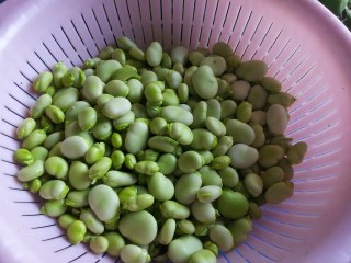 First of all boil the shelled beans for 3 – 5 minutes depending on size. As the beans are young at this time of the year they really only 1-2 minutes but as they grow larger and older they will need the longer time. To make them cool enough to handle, tip the beans into a sieve and run the cooked beans under a cold tap.