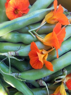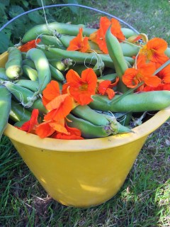 The orange or red nasturtium is more than a colourful companion to the beans in the garden, the flower’s peppery flavour goes well with the beans in a salad. |
