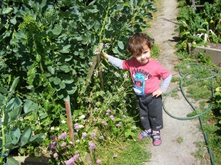 Hunter from Christchurch – a gardener in the making beside Ken’s crop of broad beans. Photograph: Ken Rouse |
