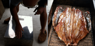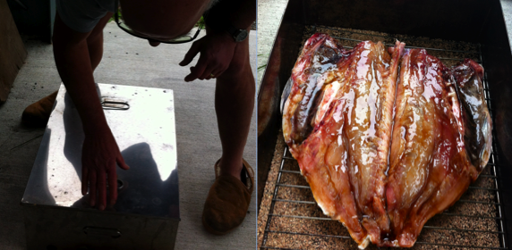 While out smelling the sweet peas, another delicious smell took my attention. Wal was smoking the fish that was to be the entree for our special dinner.