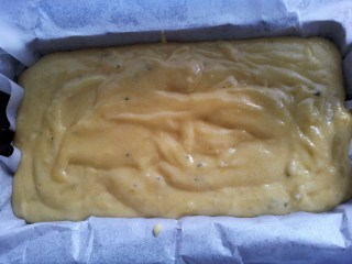 Pour the batter into the loaf tin, and spread evenly with the back of a spoon, then bake for about 1 hour, or until a cake tester comes out clean.