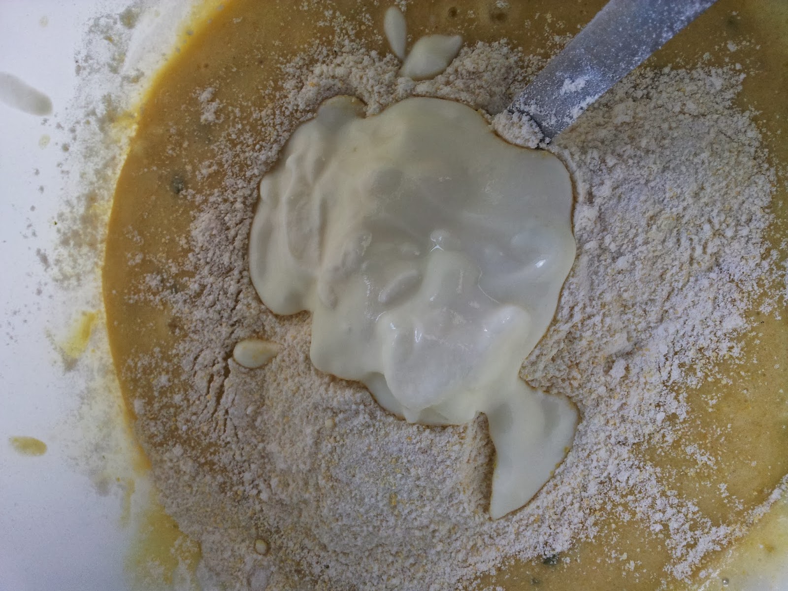 With a metal spoon, fold in half the flour mixture into the eggs, then half the yogurt until mixed.