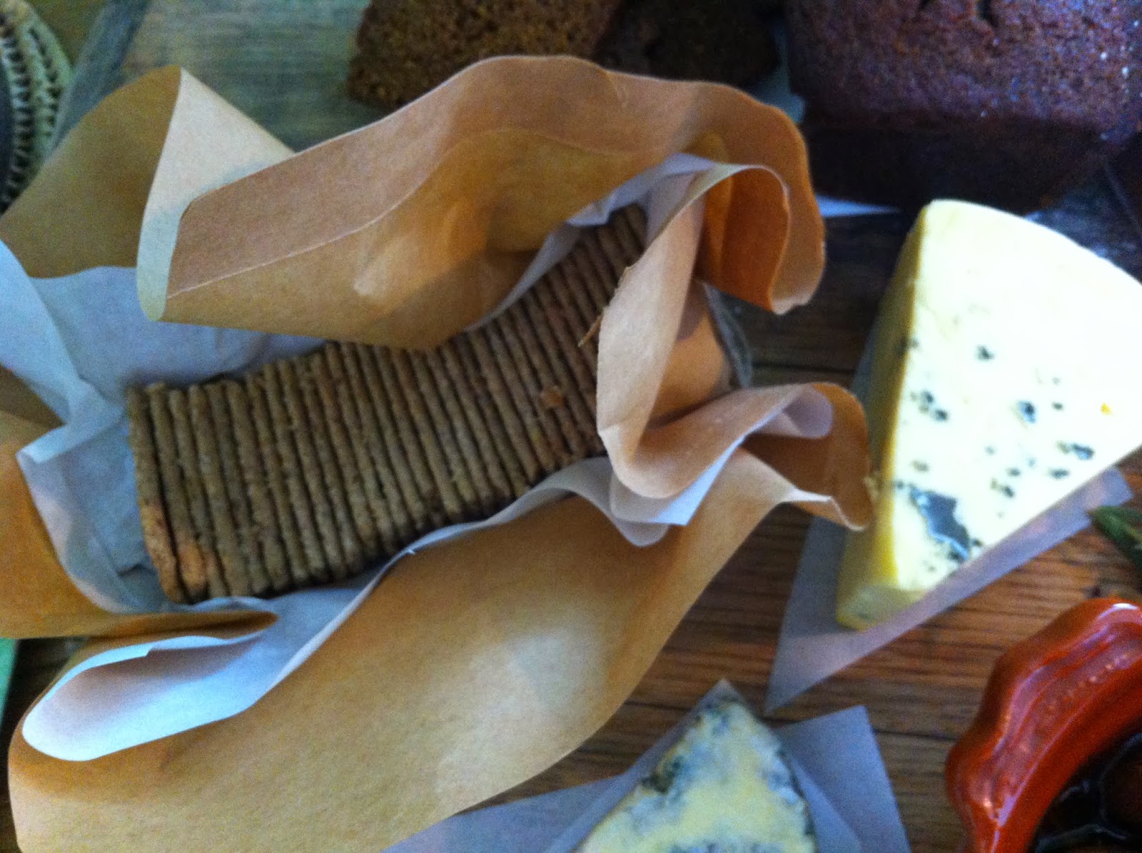 A great way of presenting crackers or biscuits on a platter – a layer of kitchen paper and brown paper tied up with twine. |