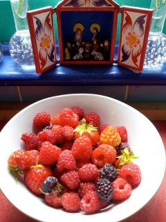 Berries collected from my sister Kerry’s garden set against one of her many nativity scenes around the cottage |