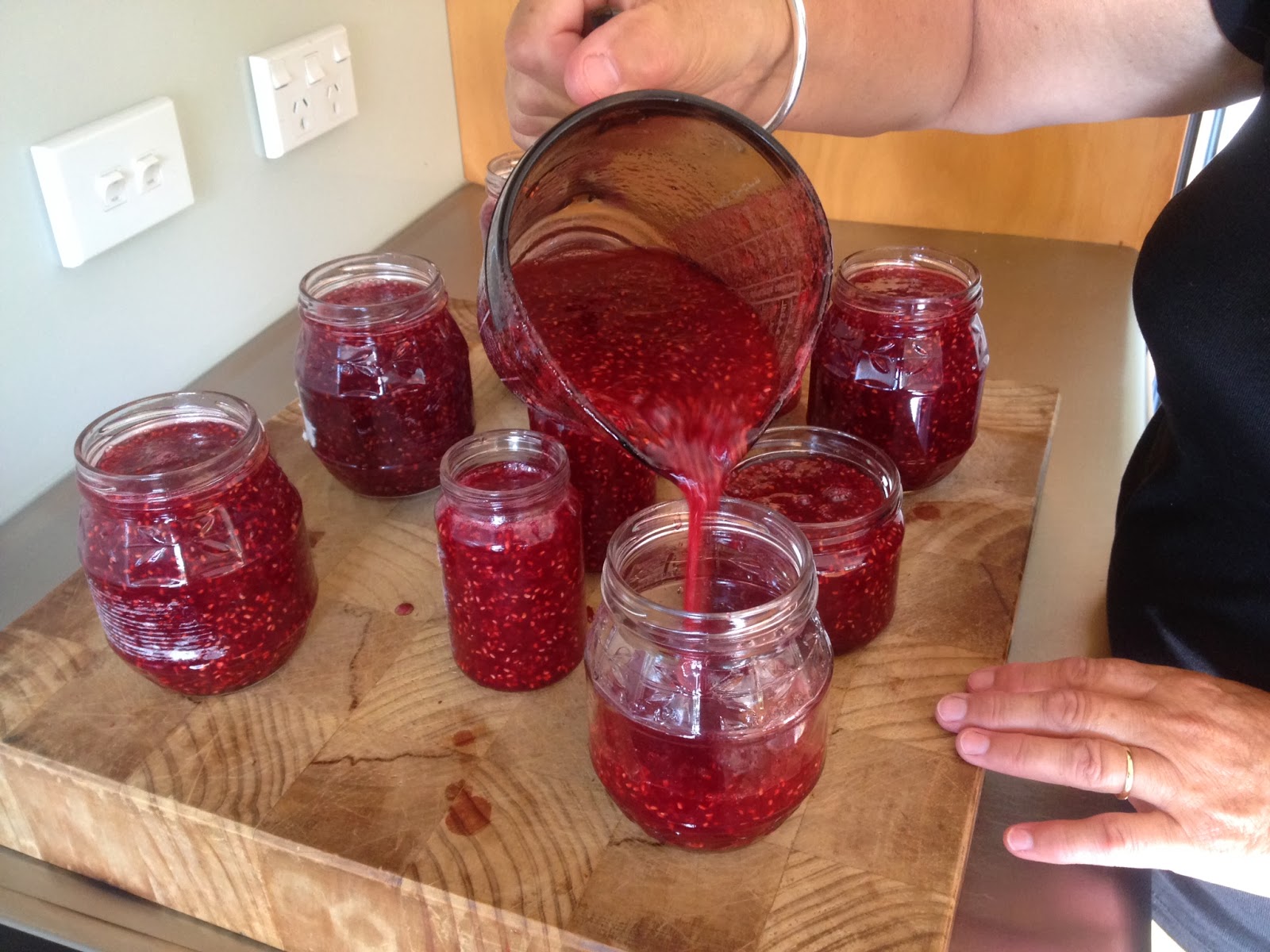 Photographs of raspberry jam production by Lynn Dunn, beside the southern Christmas Tree, the Pohutakawa, no doubt grown in their Ribbonwood Nursery, Dunedin. |