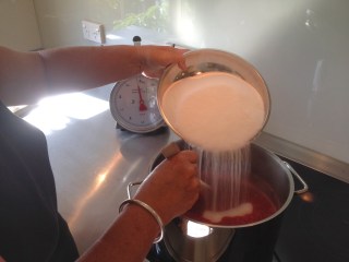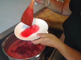 The fruit is cooked on a low heat for a few minutes until the berry structure has started to break down. The heat is then turned up and the sugar added slowly while maintaining a good boil.