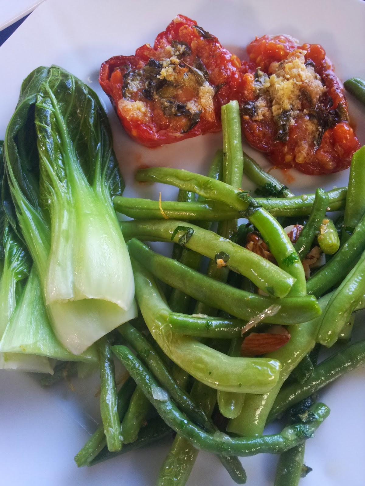I enjoyed the beans with slowly baked basil tomatoes and some delicious Bok Choy |