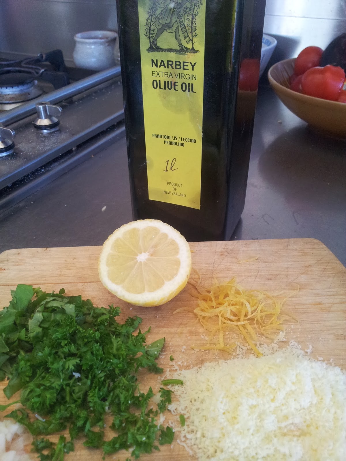 Parmesan, chopped almonds, lemon zest, lemon juice, olive oil, garlic and parsley (I am running a little short on parsley so have also added basil).