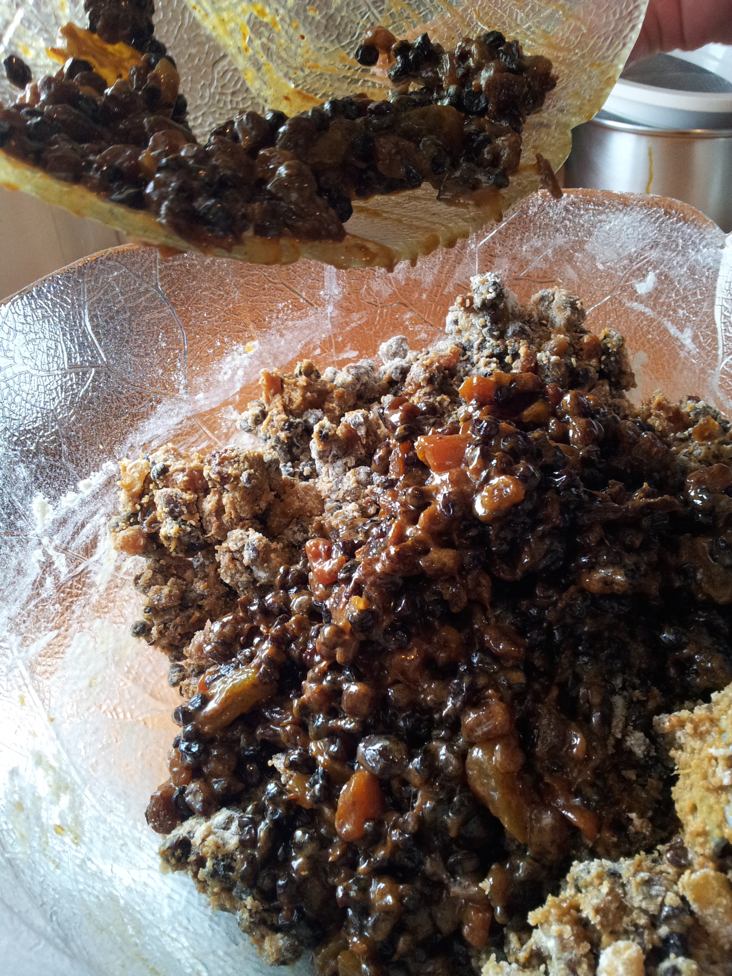 Ideally in a mixer beat the eggs and sugar until light and fluffy. Add the treacle and mix again. Add the fruit puree to this mix. Mix the soaked dried fruit and spices into this mix.