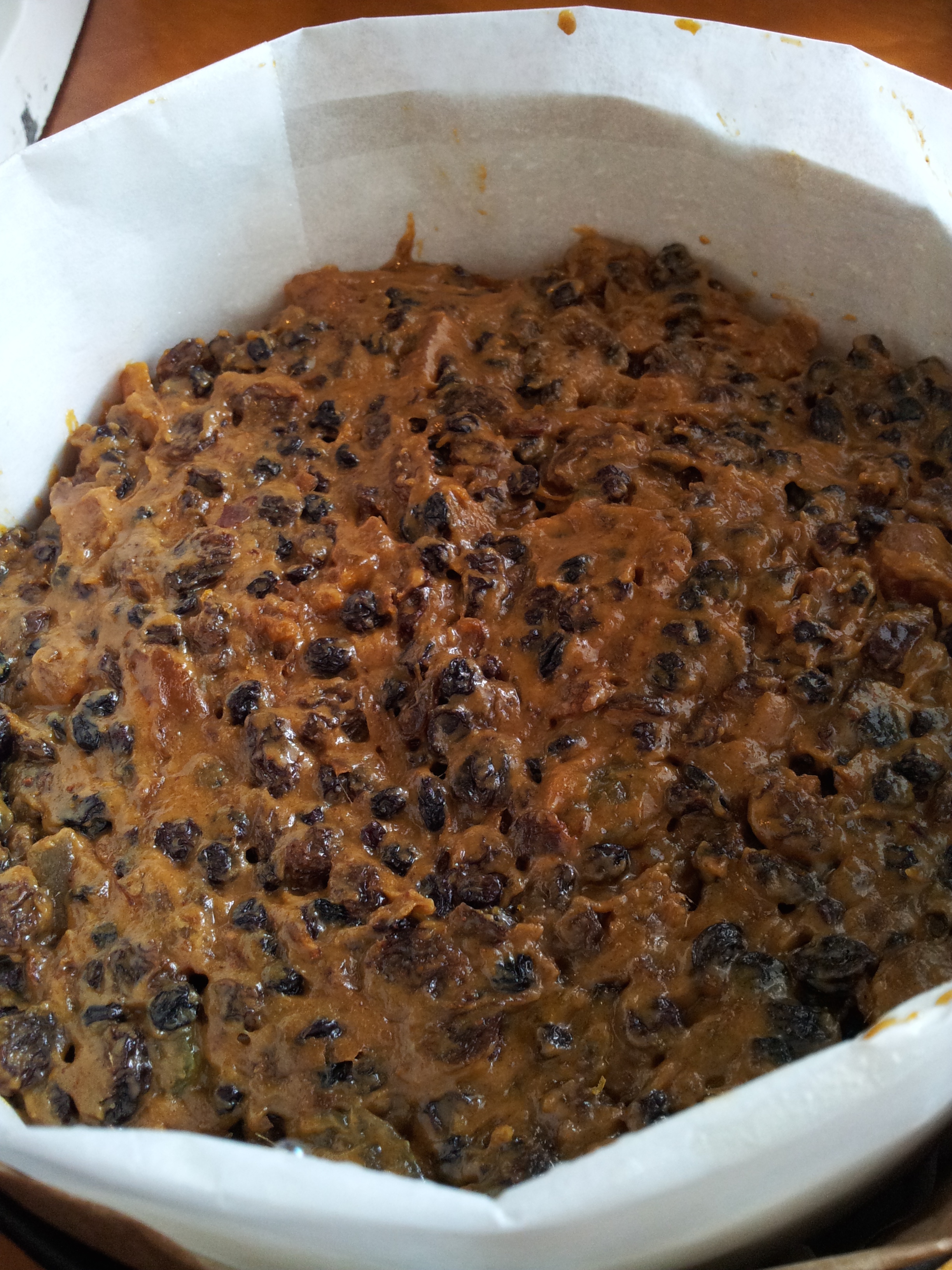The recipe called for a 20cm square cake tin (I always remember our Christmas cakes being square rather than round) or a 22cm round tin. I only had a 20cm round so I knew the cake may take slightly longer to cook through and could need a little more height so we kept the paper barrier higher than the tin just in case.