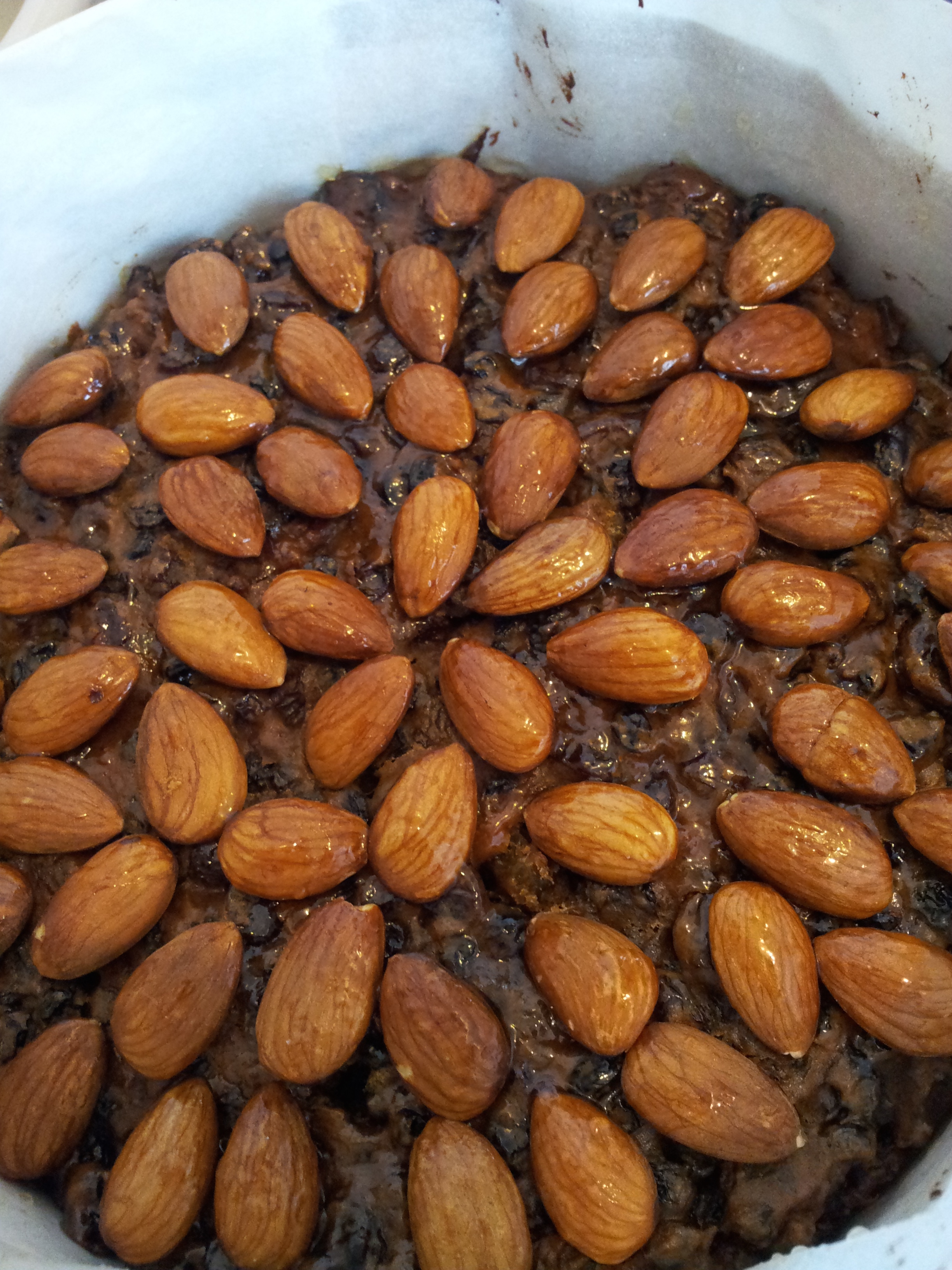 In the recipe it suggested placing the almonds to decorate before putting in the oven but another recipe said to do this one hour before the end. I decided to try for the latter so that the almonds wouldn’t get too overcooked. This is unnecessary if you are planning to ice the cake. In our case I wanted the almonds on top because Peter had omitted putting the nuts into the mix, so this definitely made me decide that we would use almonds instead of icing.