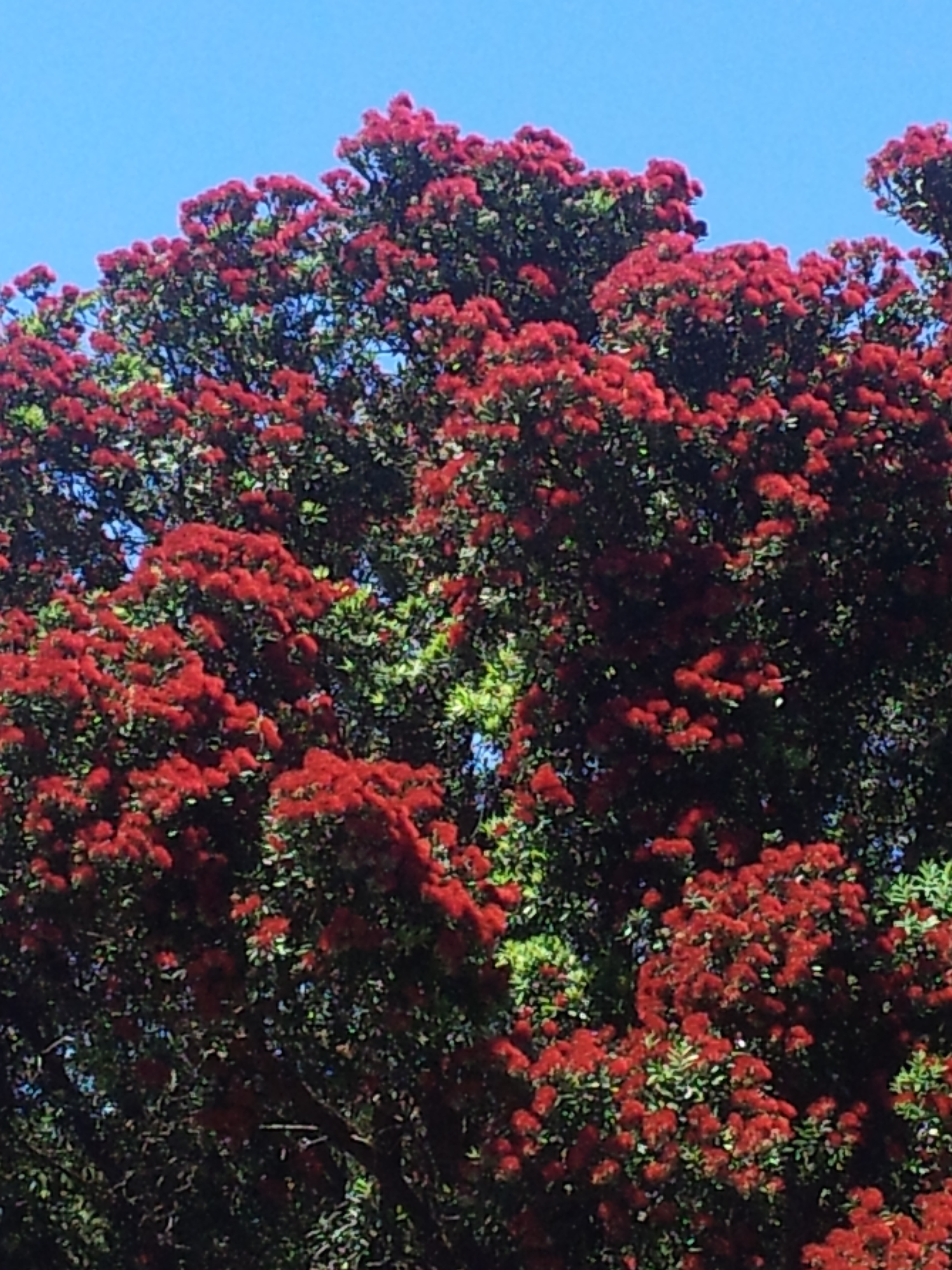 You are greeted when you arrive at Waiheke Island on the ferry by Pohutukawa trees along the shoreline. I couldn’t resist taking a photo with the blue summer sky against the intense red of our Christmas tree. (I have to admit this summer so far these days are rare.)