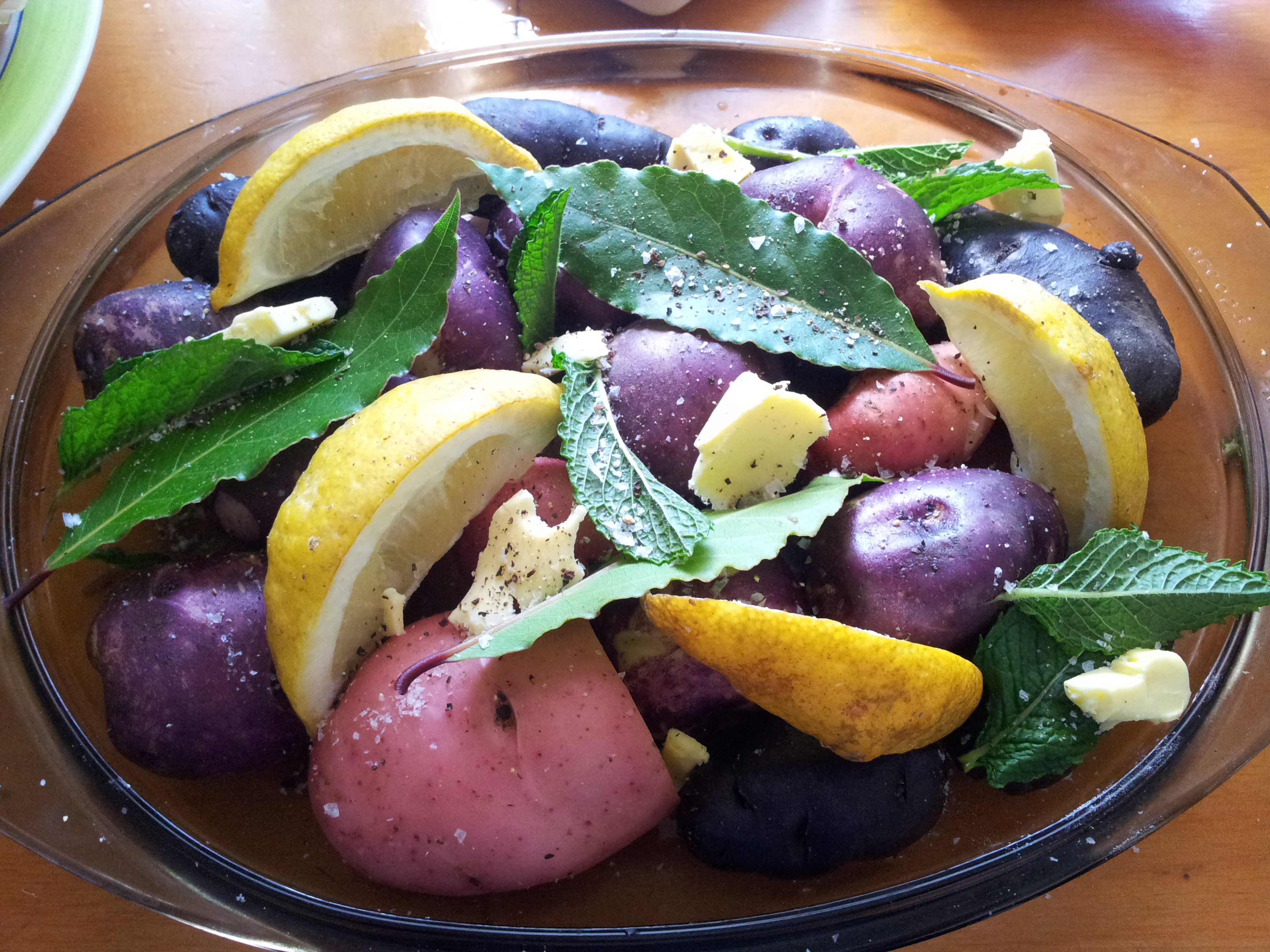 Place washed potatoes into an oven dish, slice half a lemon into segments and place on top, Add some mint leaves and I like to also add a couple of bay tree leaves. Season with salt and pepper and either dot with butter as I have above or your favourite oil. Cover with foil and cook in an oven for around 50 minutes at 180 Celsius.