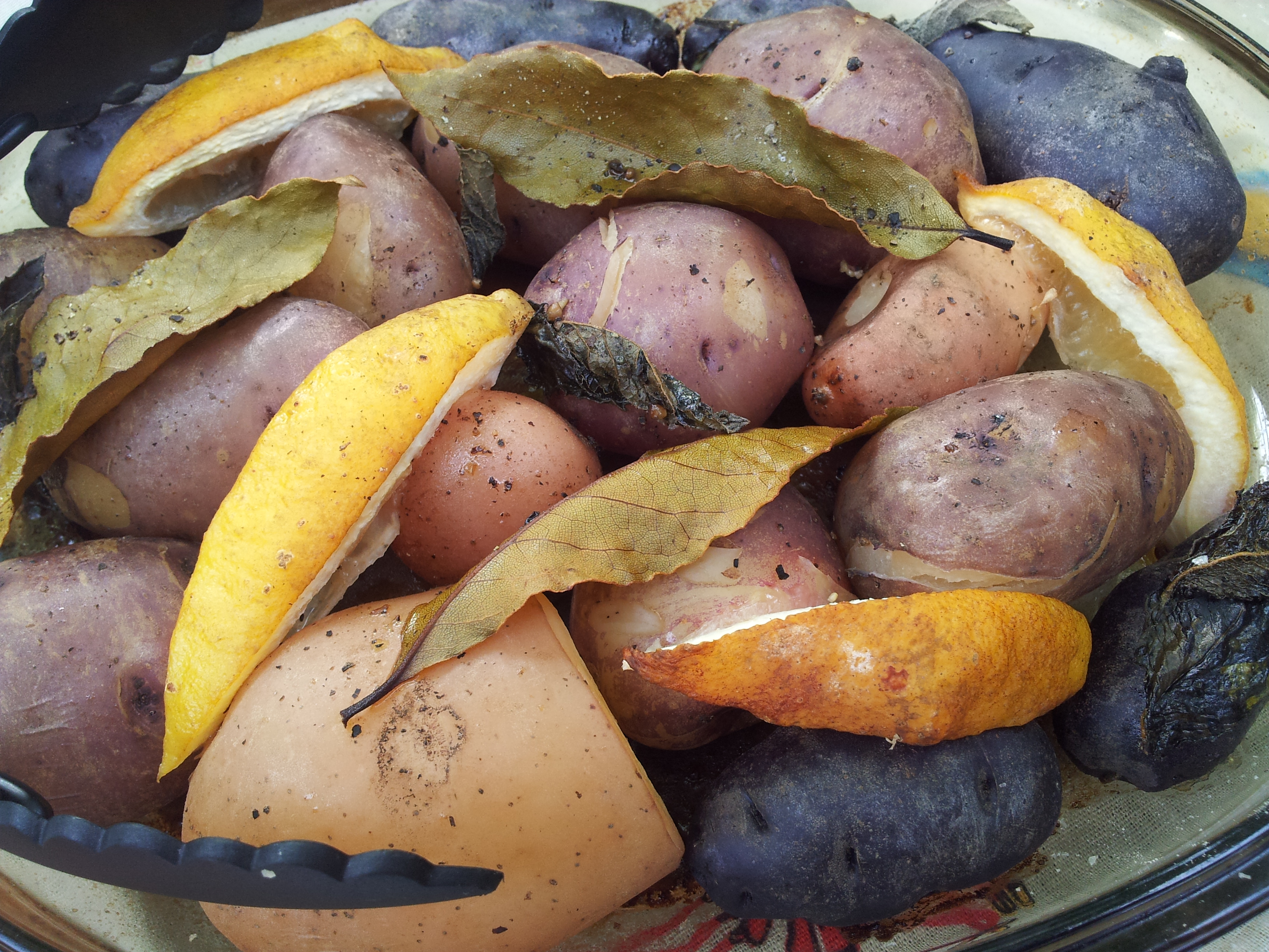The potatoes before being put in the oven. You can vary the flavouring – a favourite of mine is to put in unpeeled garlic cloves.